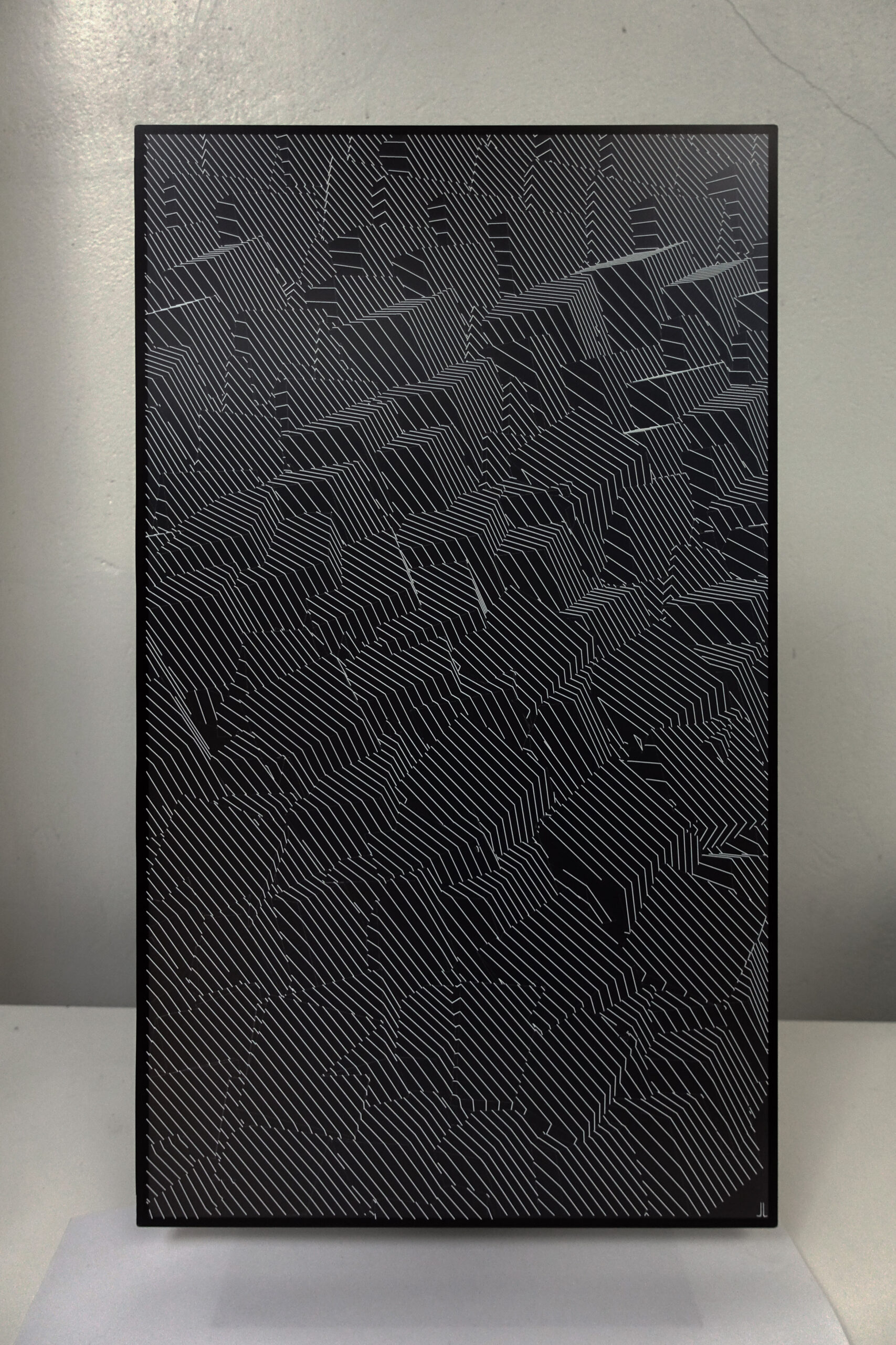 A layer of light is applied to the surface of the print, creating shadows and bringing depth to the flat print, extruding volumes, turning negative shapes into three dimensional objects. The motif series are the continuation of Joanie’ light canvas series, focusing mostly on optical illusions and showing how the audience perception can be deceived, which questions the very nature of perception and the notion of reality.