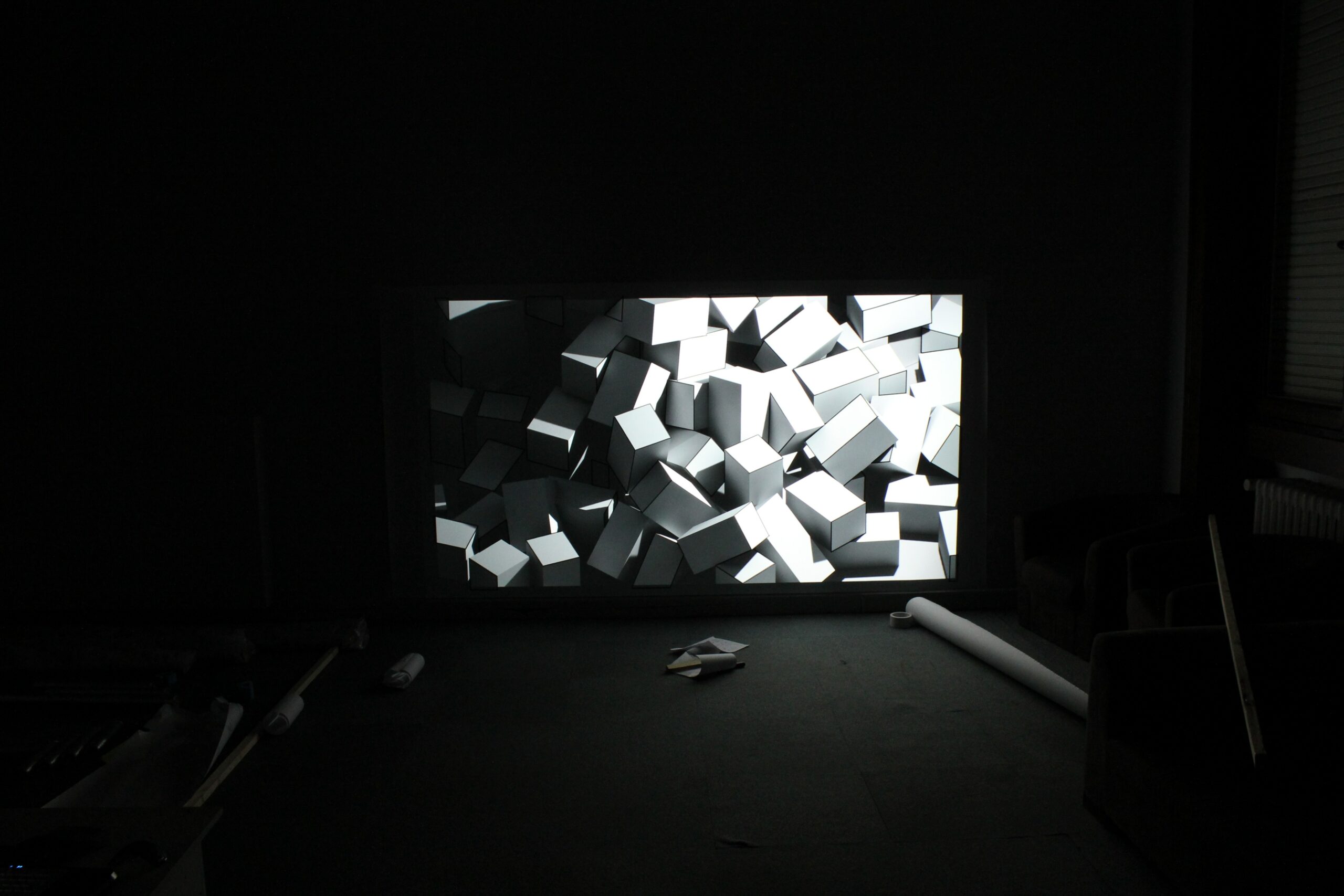In the light canvases’ body of work, precise light beams pass over an array of rectangular structures printed on a flat surface. Darkness and illumination alternates to create an immersive three-dimensional experience transforming our sense of space. As Edward Rothstein wrote in the NY Times in 2011 in an article called “When Pictures Leap to Other Screens”, there really is a thrill to these experiments. You are amazed at the technology while being entranced by the effects. Moving images, though the familiar substance of experience, have only been created in recent centuries. They seem more real than still images, but are more artificial in themselves, even unsettling; they resemble experience but seem divorced from it, even supplanting it. And while a still image proclaims permanence, a moving image is evanescent. Whatever the medium, it also has unusual power to affect perceptions and inspire amazement”.