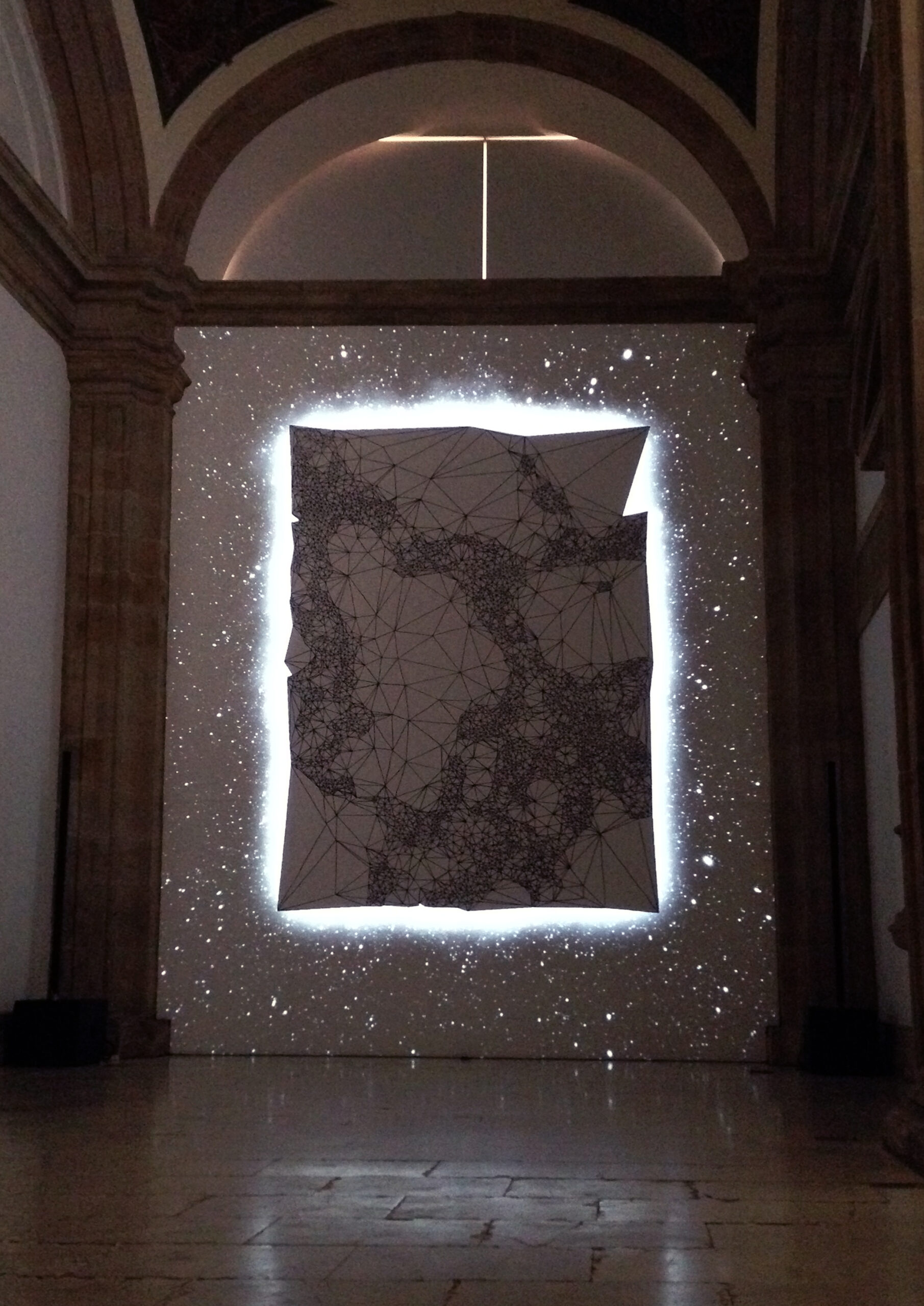 This piece is part of Wall Drawing, a series of audiovisual installations where the visuals are directly drawn over the walls, and then augmented with a light projection, in order to alter our senses by generating impossible volumes and depth.